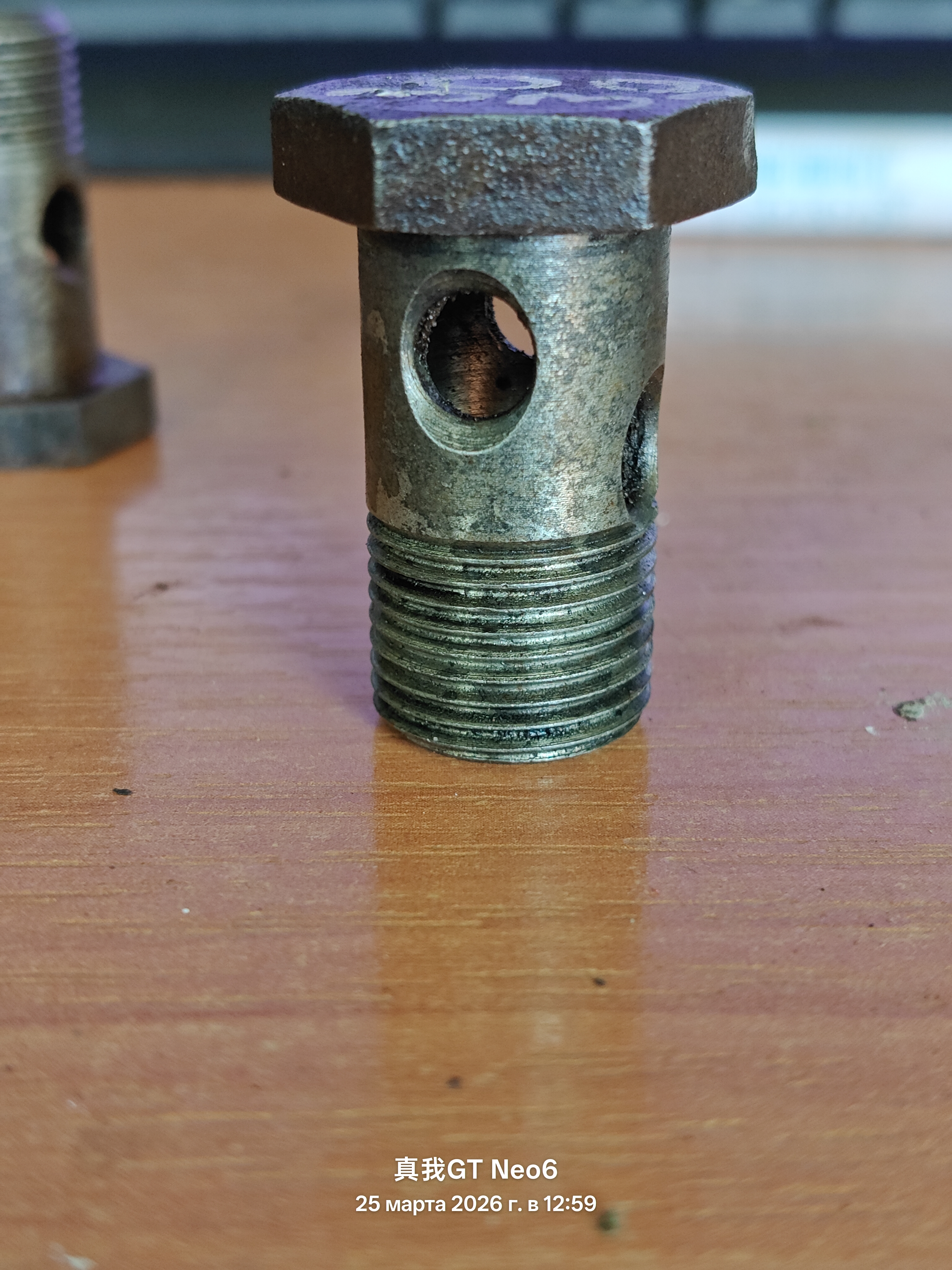 полый болт 4 отверстия внутренний диаметр-5мм наружный диаметр-12мм высота с шляпкой-44мм без шляпки-38мм шаг резьбы-1,5